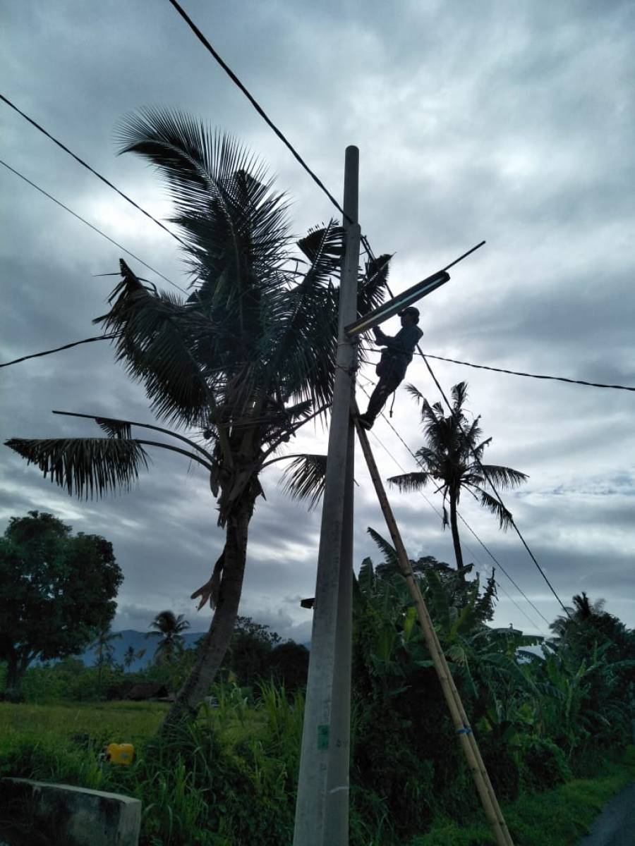 Desa Bakung, Kecamatan Sukasada, Kabupaten Buleleng (29/01/19) tenaga pemeliharaan Penerangan Jalan Umum (PJU) Dinas Pekerjaan Umum dan Penataan Ruang Kabupaten Buleleng melakukan penanganan lampu penerangan jalan umum berupa lampu neon atau yang biasa disebut dengan Lampu TL “tube luminescent” (40 watt) yang mati akibat umur ketahanan lampu dengan menggunakan tangga manual dari bambu karena lokasi yang kurang memadai. *HMd*