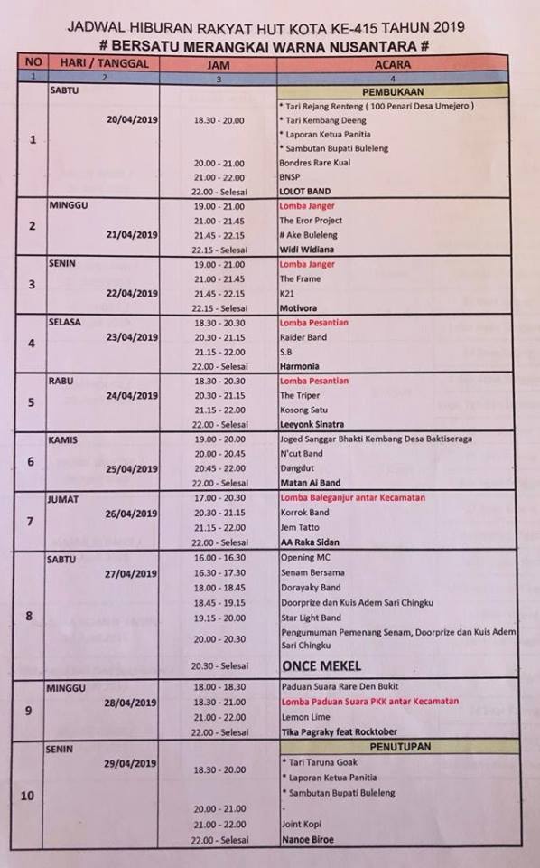 JADWAL HIBURAN RAKYAT HUT KOTA SINGARAJA KE-415 TAHUN 2019