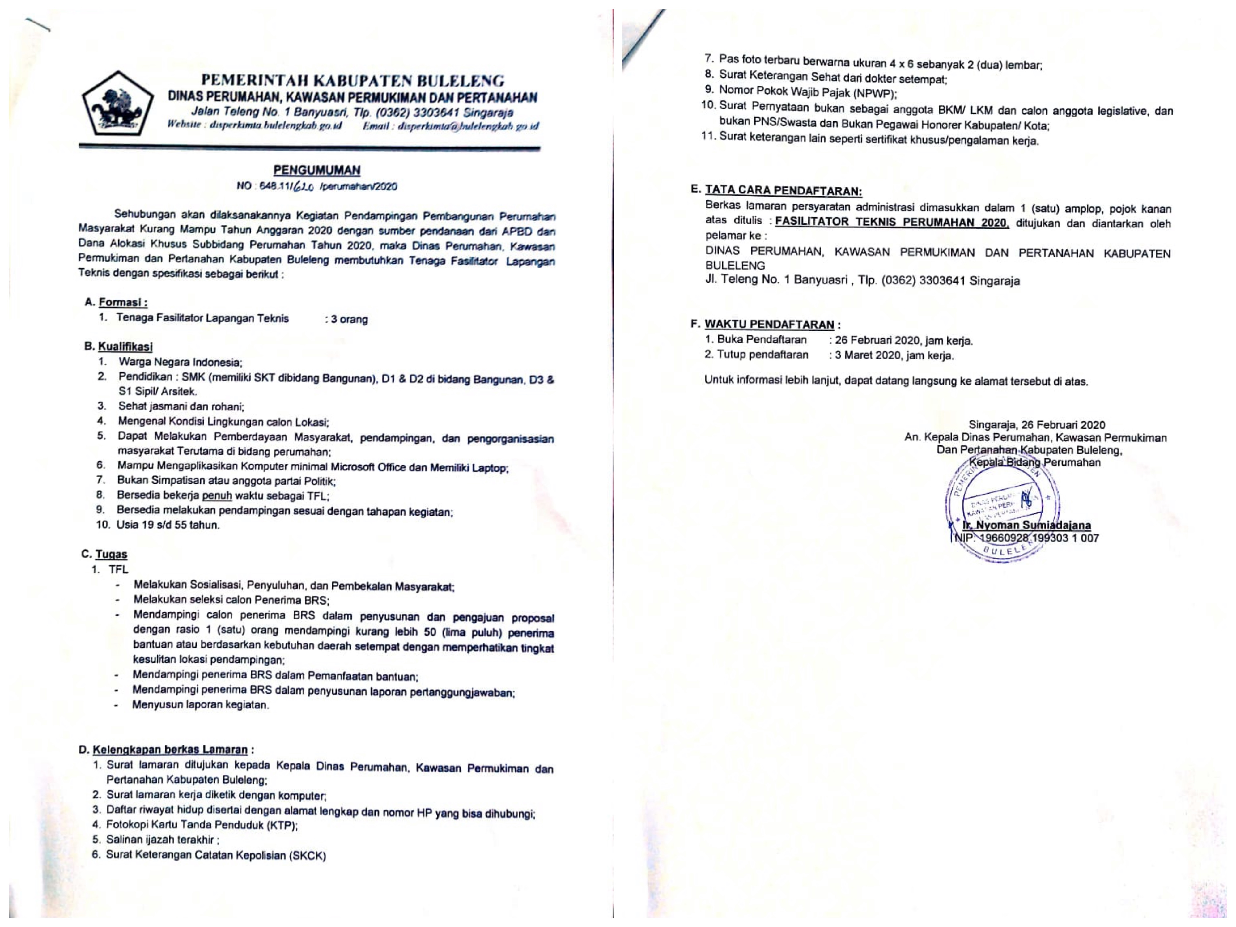 Rekrutmen Tenaga Fasilitator Lapangan Teknis 2020 Bidang Perumahan.
