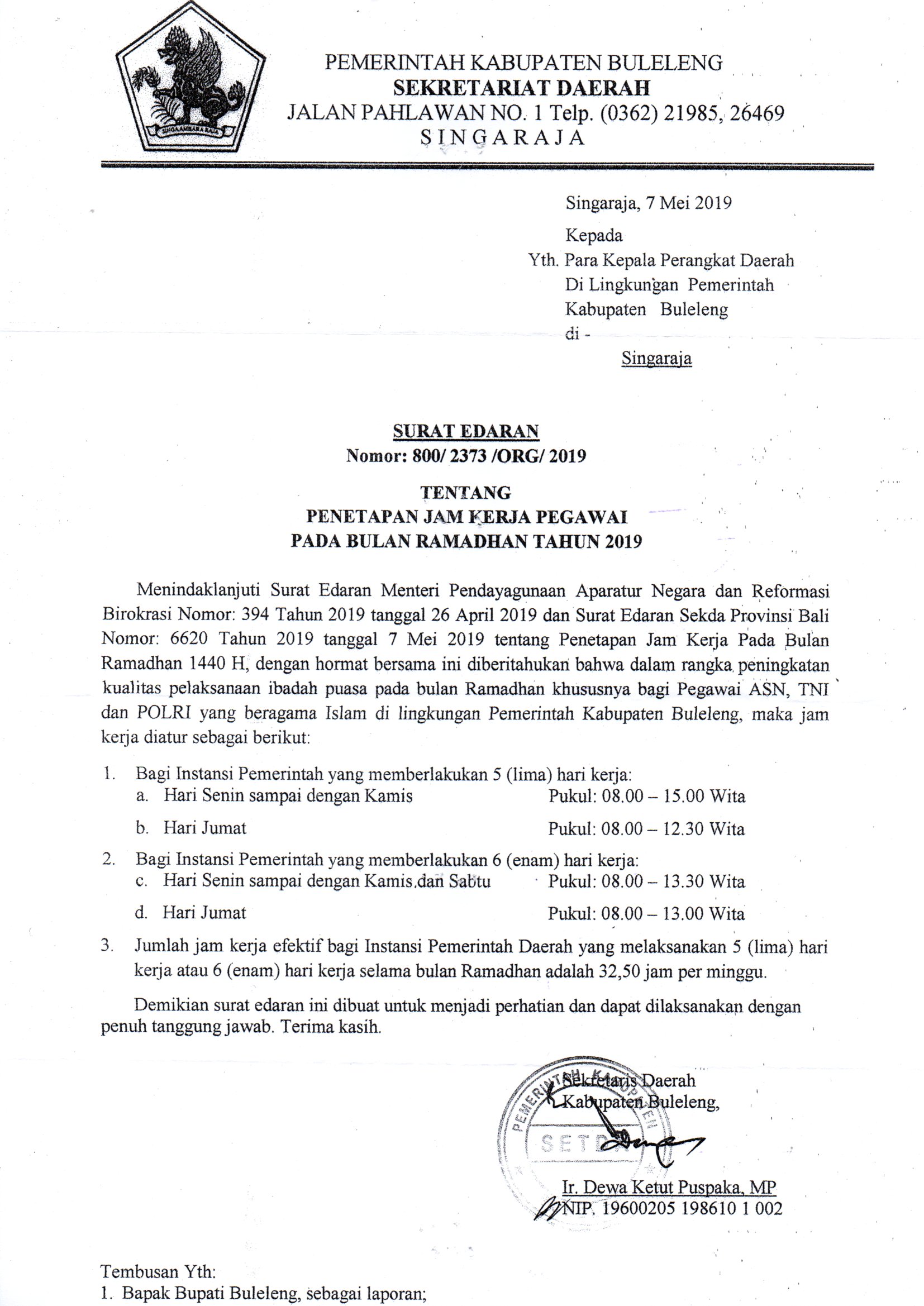 SURAT EDARAN SETDA KABUPATEN BULELENG TENTANG JAM KERJA DI BULAN RAMADHAN